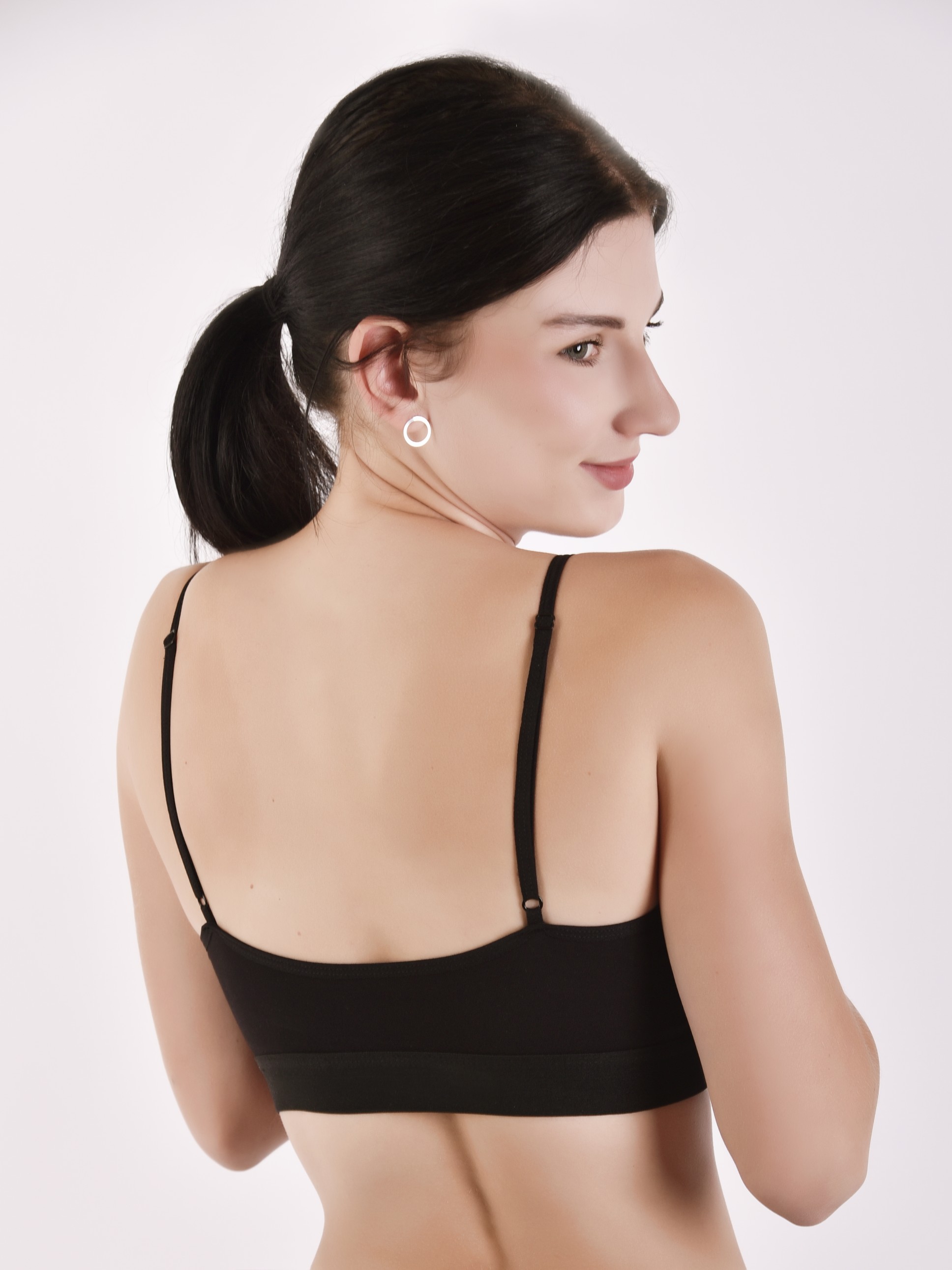 . Pohodlný sportovní top bez výztuže a kostic, ideální pro menší poprsí. Jednoduchý střih s vykrojenými zády zajišťuje volnost pohybu, širší pružná guma pod prsy drží top na místě. Vhodný na volný čas, lehké cvičení i každodenní nošení.