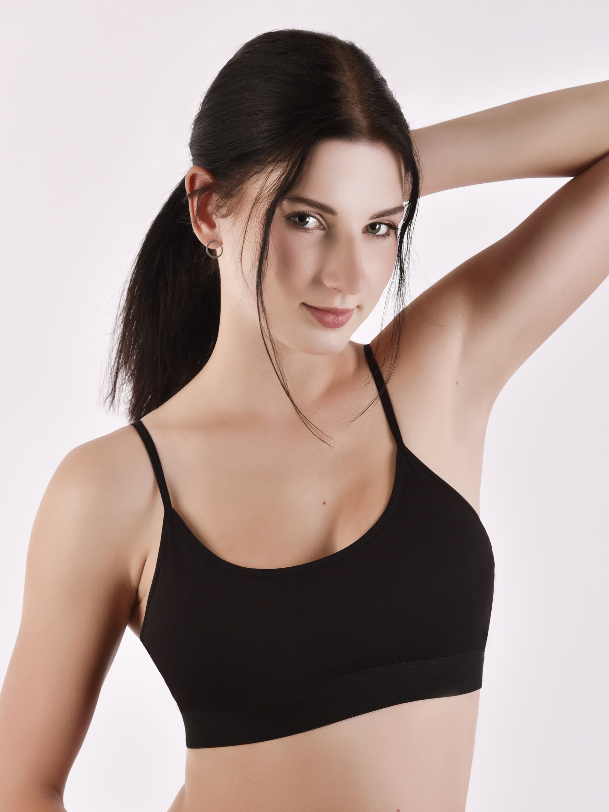 Bavlněný top . Pohodlný sportovní top bez výztuže a kostic, ideální pro menší poprsí. Jednoduchý střih s vykrojenými zády zajišťuje volnost pohybu, širší pružná guma pod prsy drží top na místě. Vhodný na volný čas, lehké cvičení i každodenní nošení. Vyroben z příjemné směsi bavlny a elastanu – materiál je prodyšný, měkký na dotek a mírně pružný pro lepší přizpůsobení postavě.
