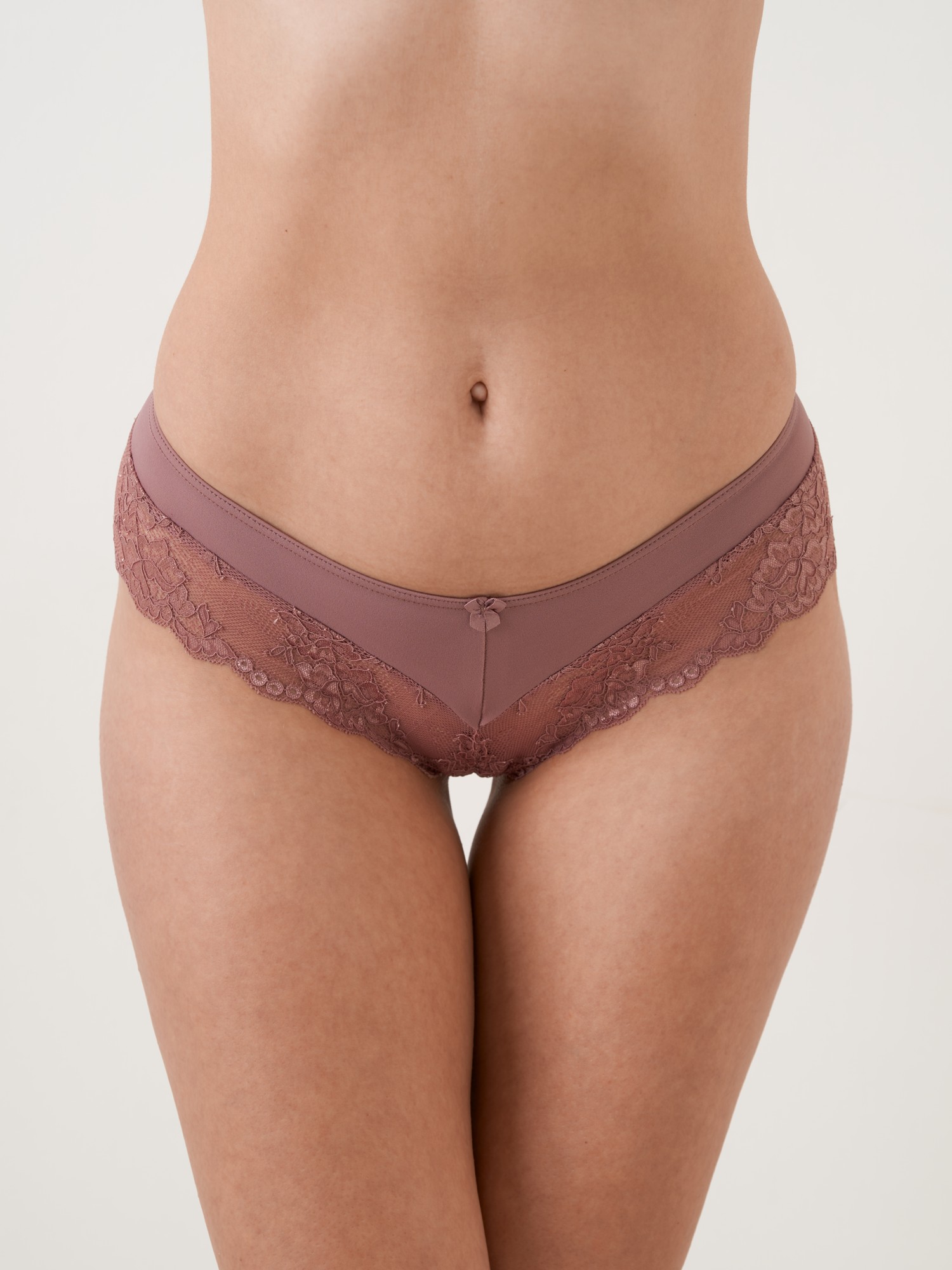 Elegantní kalhotky z jemného mikrovlákna doplněné o krajku na přední i zadní části. Přední díl má hladký střed a krajkové lemování nohaviček, které působí velmi ženským dojmem. Zadní část krásně zvýrazní linii boků. Materiál je příjemný na dotek, pružný a dokonale se přizpůsobí postavě. * Materiál: jemné mikrovlákno a elastická krajka * Přední část: hladký střed, krajka na nohavičkách * Zadní část: jemné mikrovlákno a elastická krajka * Střih: brazilky – elegantní a pohodlný * Vhodné pro každodenní nošení i romantické chvíle