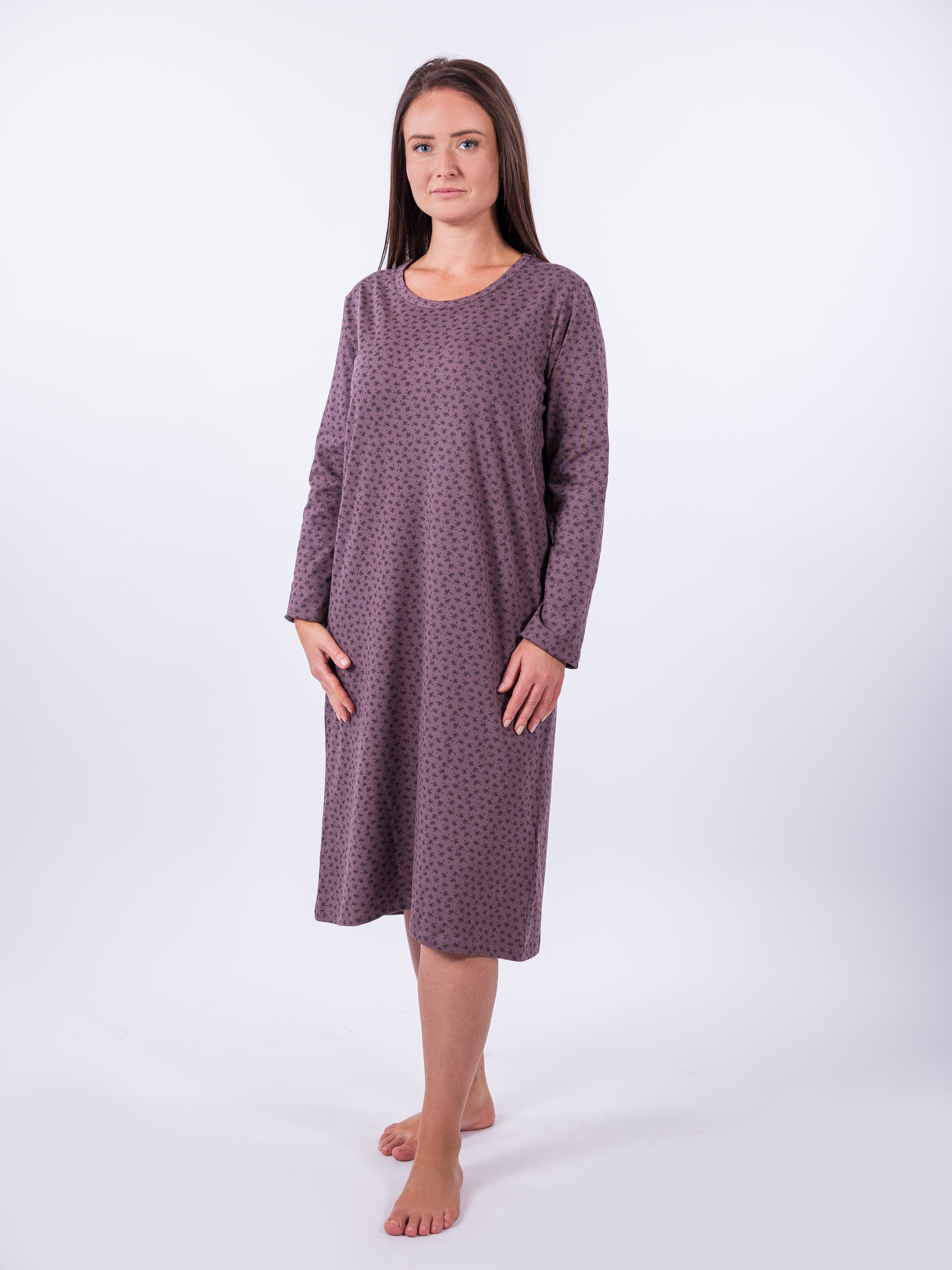 Objevte elegantní noční košili AGRIA, která je stvořena pro váš každodenní odpočinek. Tato fialová košile s jemným vzorem je vyrobena z kvalitní směsi 95% bavlny a 5% elastanu, což zaručuje pružnost i příjemný pocit na pokožce. Střední délka a dlouhé rukávy přispívají k celkové praktičnosti a komfortu, ideální pro chladnější noci. Košile AGRIA je perfektní volbou pro ženy, které hledají jednoduchost a pohodlí bez kompromisů.