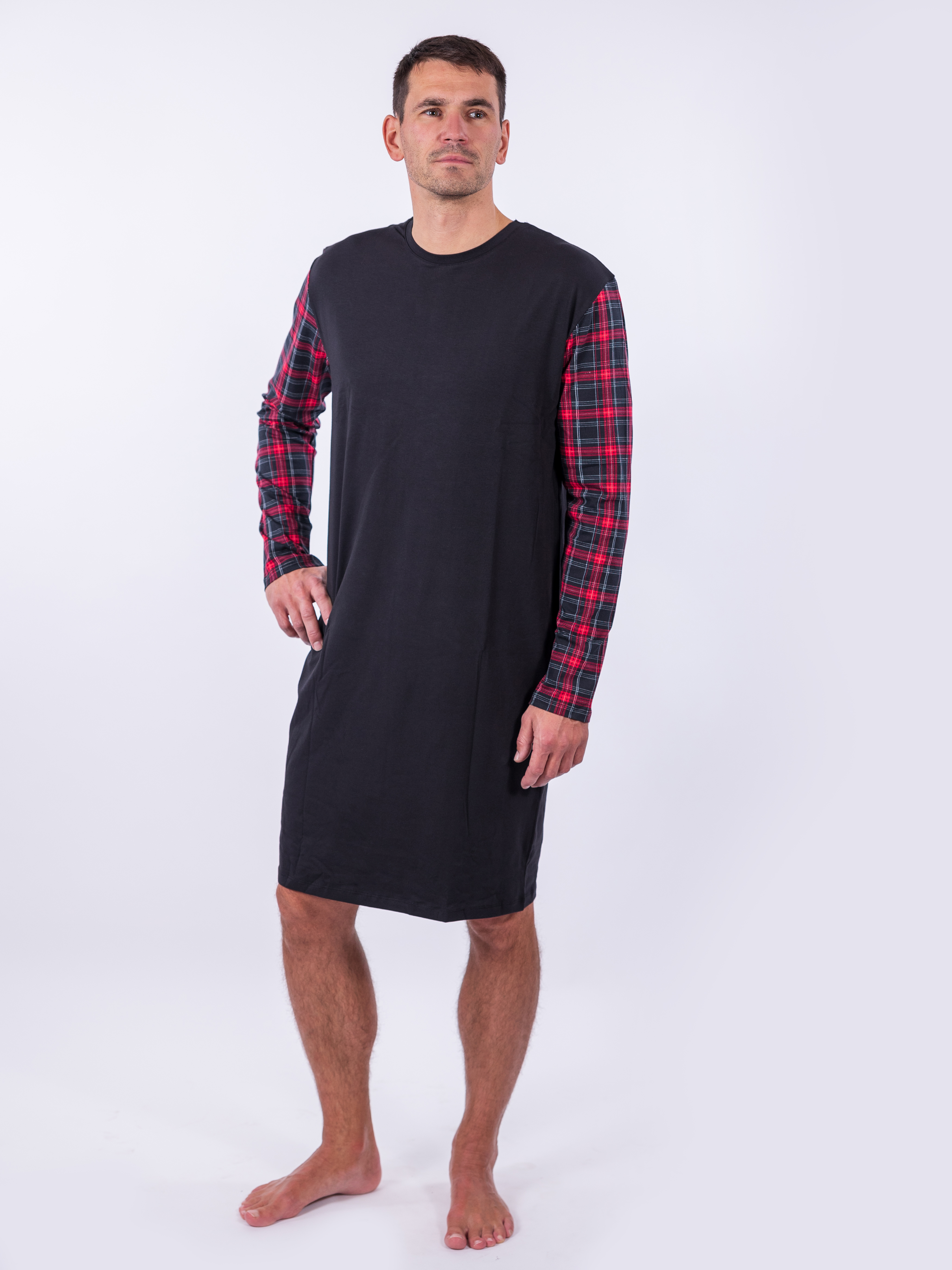 Noční košile BOB nabízí jedinečné spojení klasického designu a komfortu. Černá košile s kontrastními károvanými rukávy zaujme svým originálním vzhledem. Vyrobena z kvalitní směsi 95% bavlny a 5% elastanu, zajišťuje maximální pohodlí a volnost pohybu. Dlouhé rukávy a délka ke kolenům ji činí ideální volbou pro chladnější večery. Perfektní pro každodenní nošení nebo jako dárek pro muže, kteří si potrpí na stylové a praktické oblečení na spaní.
