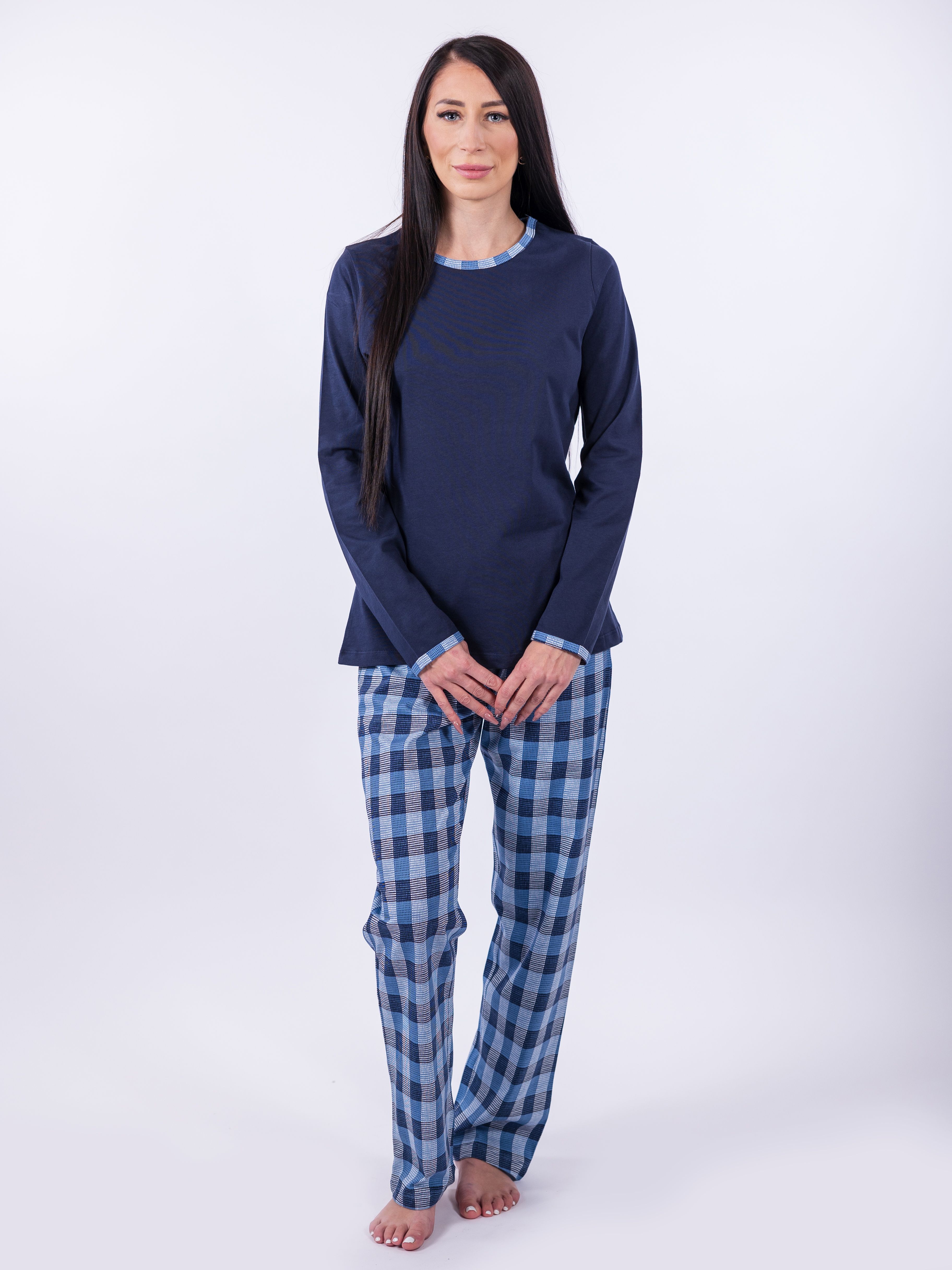 Pyžamo JULIE nabízí stylový a útulný zážitek z nošení. Tento dámský pyžamový set zahrnuje tmavě modré tričko s dlouhým rukávem a kostkované kalhoty v modré barvě. Kombinace 95% bavlny a 5% elastanu zajišťuje příjemný pocit na pokožce, přizpůsobivost a komfortní pohyb. Pyžamo JULIE je ideální pro chladnější noci, kdy hledáte pohodlí i eleganci. Pyžamo JULIE je ideálním doplňkem pro dámský šatník, skvěle se hodí jak na relaxaci doma, tak na spaní. Ideální volba pro ženy, které ocení kombinaci komfortu a stylu v jednom.