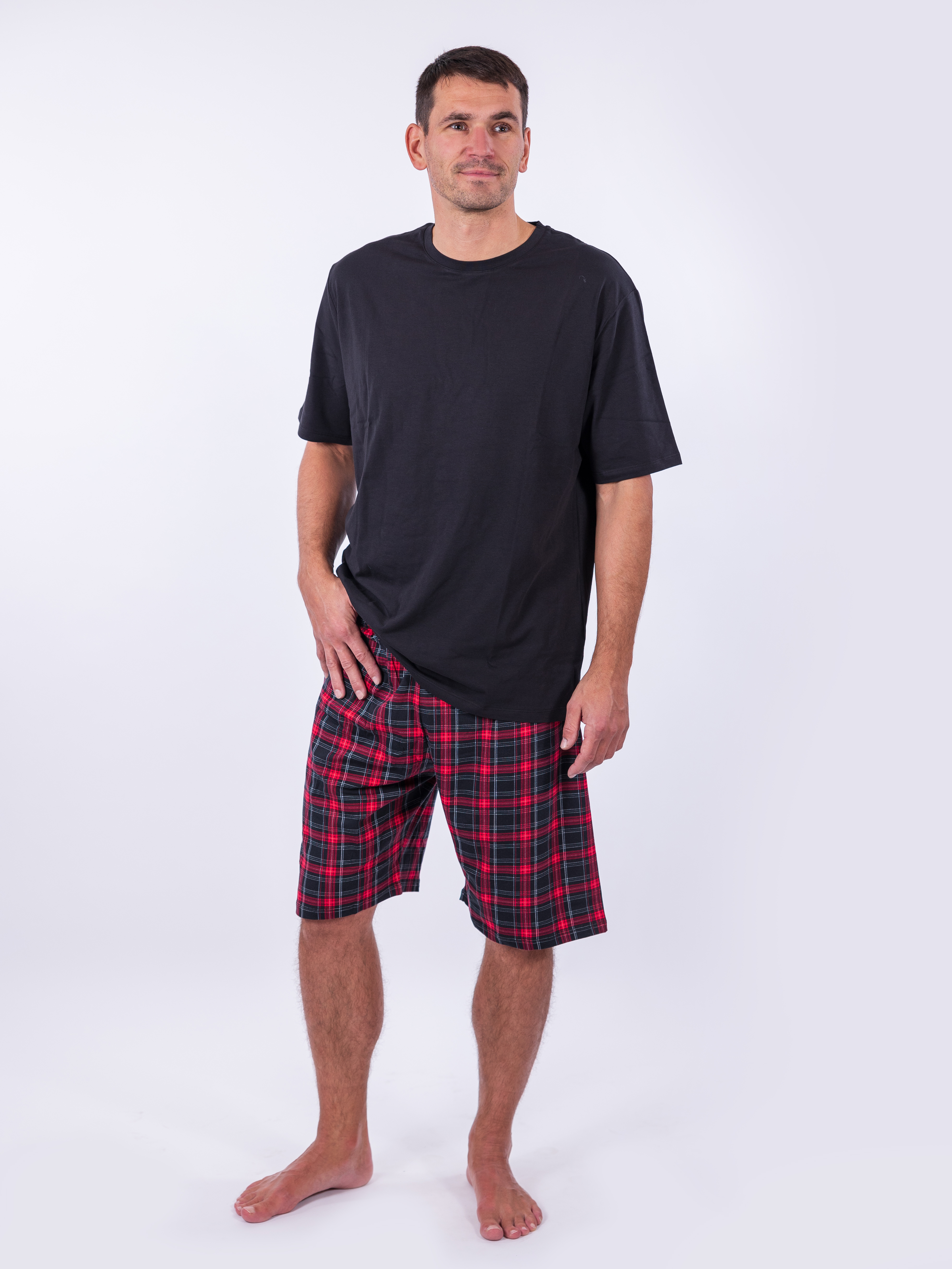 Pyžamo LEONARDO je dokonalou kombinací pohodlí a stylu. Černé tričko s krátkým rukávem je doplněno výraznými károvanými kraťasy, které zaujmou svým tradičním vzorem. Díky kvalitnímu složení z 95% bavlny a 5% elastanu poskytuje pyžamo příjemný pocit při nošení a dostatečnou pružnost. Ideální volba pro muže, kteří hledají elegantní a praktické oblečení na spaní, které zároveň vypadá skvěle.