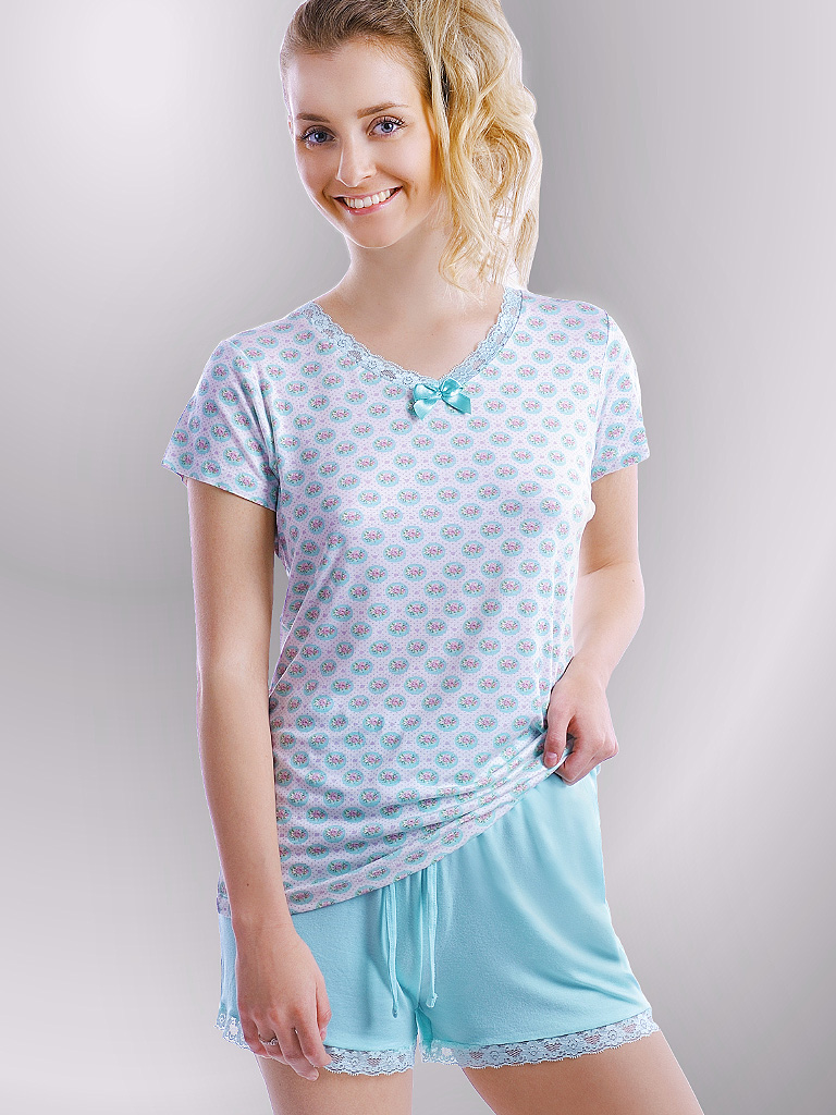 Nová kolekce 2022/2023 nabízí nová pyžama v atraktivních barvách. Pyžamo se skládá z potištěného trika s krátkým rukávem, které ladí ke kraťasům z jednobarevného materiálu. Triko i kraťásky jsou lemovány jemnou krajkou. Extra jemná a kvalitní viskoza (přírodní materiál) je ideální výběr pro klidný a pohodlný spánek. Viskoza zaručí maximální pohodlí i v letních dnech. Vyrábí se až do velikosti XXL.