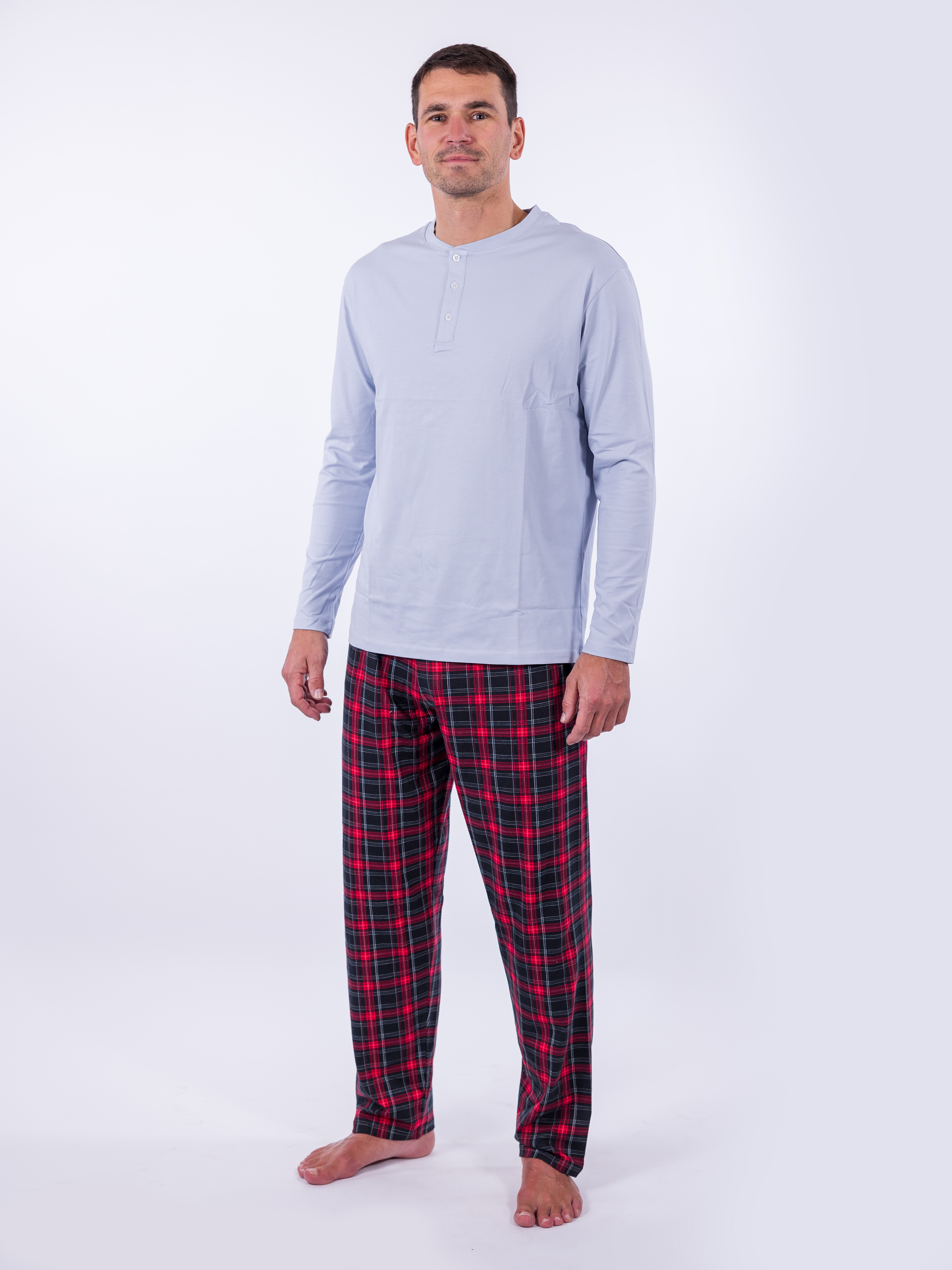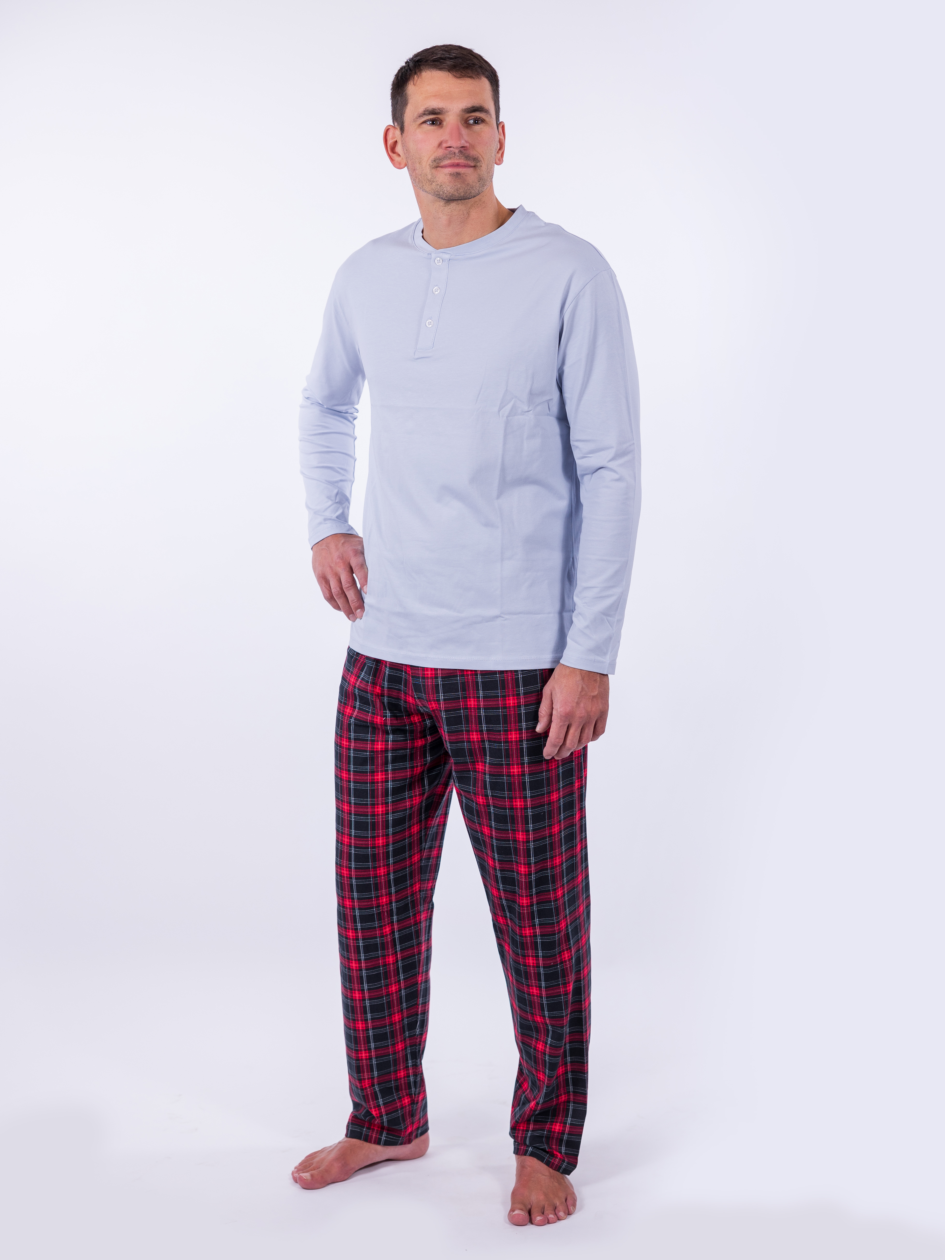Stylové a pohodlné pánské pyžamo Robert je ideální volbou pro každého muže, který ocení kvalitu a komfort. Vrchní díl je jednoduchý, v jemné světle modré barvě s dlouhými rukávy, které poskytují teplo i během chladnějších nocí. Spodní díl je vyroben z příjemného materiálu s moderním kostkovaným vzorem v červeno-černé kombinaci, která dodává pyžamu šmrnc.