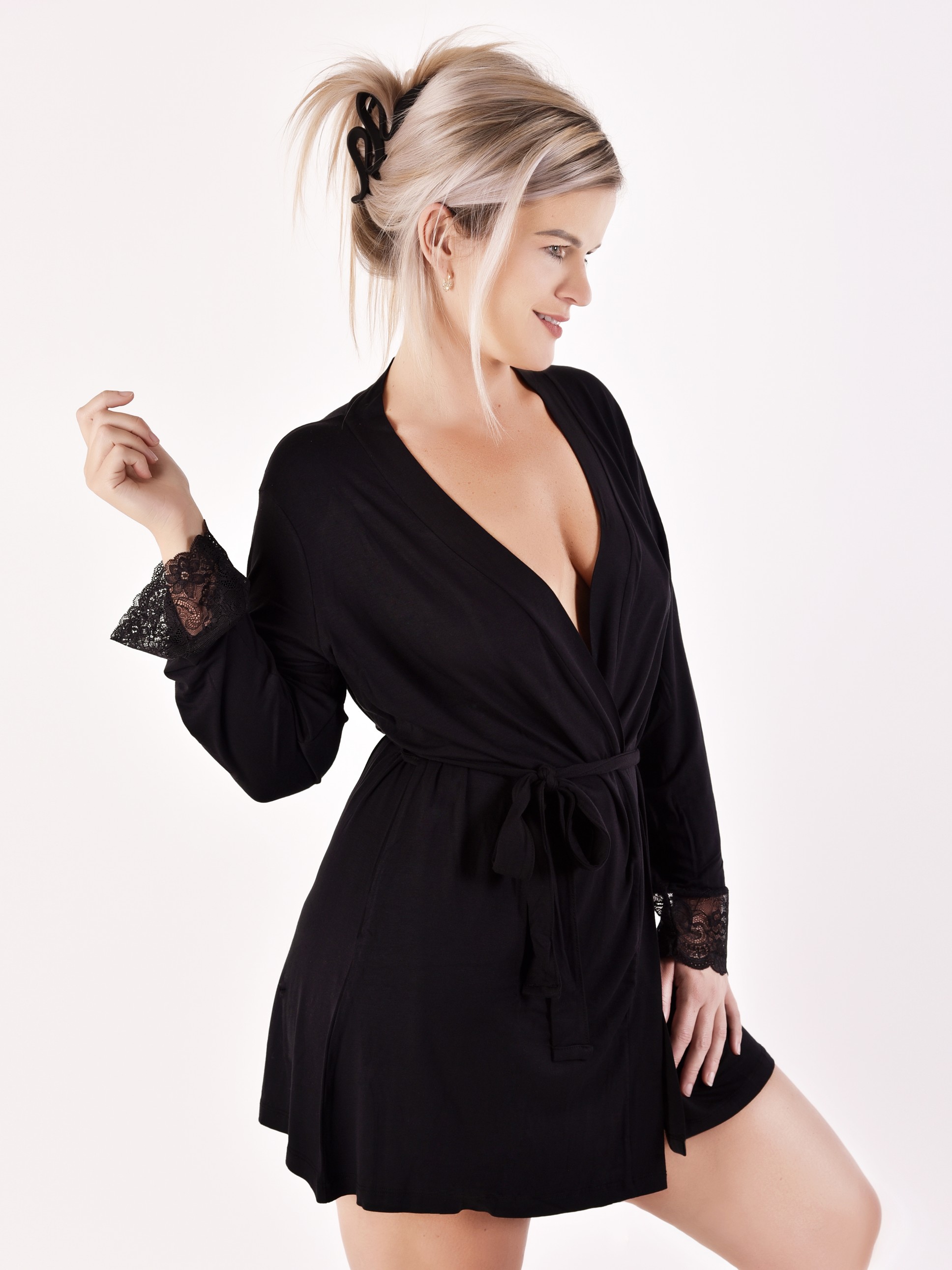 Elegantní župan Elise z příjemné viskózy v černé barvě. Má delší rukáv a zavazování v pase, díky kterému se snadno přizpůsobí postavě. Na manžetách rukávů je jemná krajka, která dodává celému županu ženský a sofistikovaný vzhled. Viskózový úplet je lehký, prodyšný a měkký, takže je župan ideální na ranní i večerní domácí pohodlí.